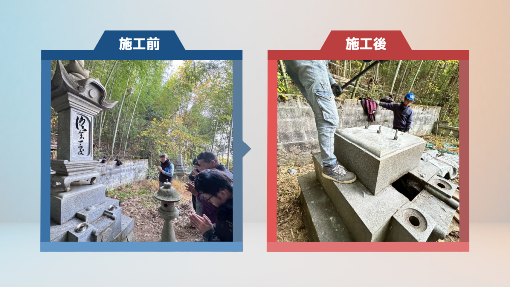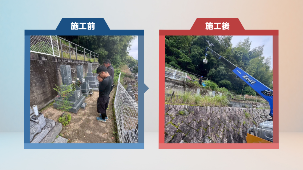 【安芸郡 坂町でお墓じまいを行いました。】 プラン:通常プラン 4基+墓所全撤去 施行内容:お墓4基分+墓所間知石撤去+防草シート施工 合計 税込89万円 本日は、地元の安芸郡坂町でお墓じまいをさせて頂きました。今回は、これまでお付き合いのあるお客... -